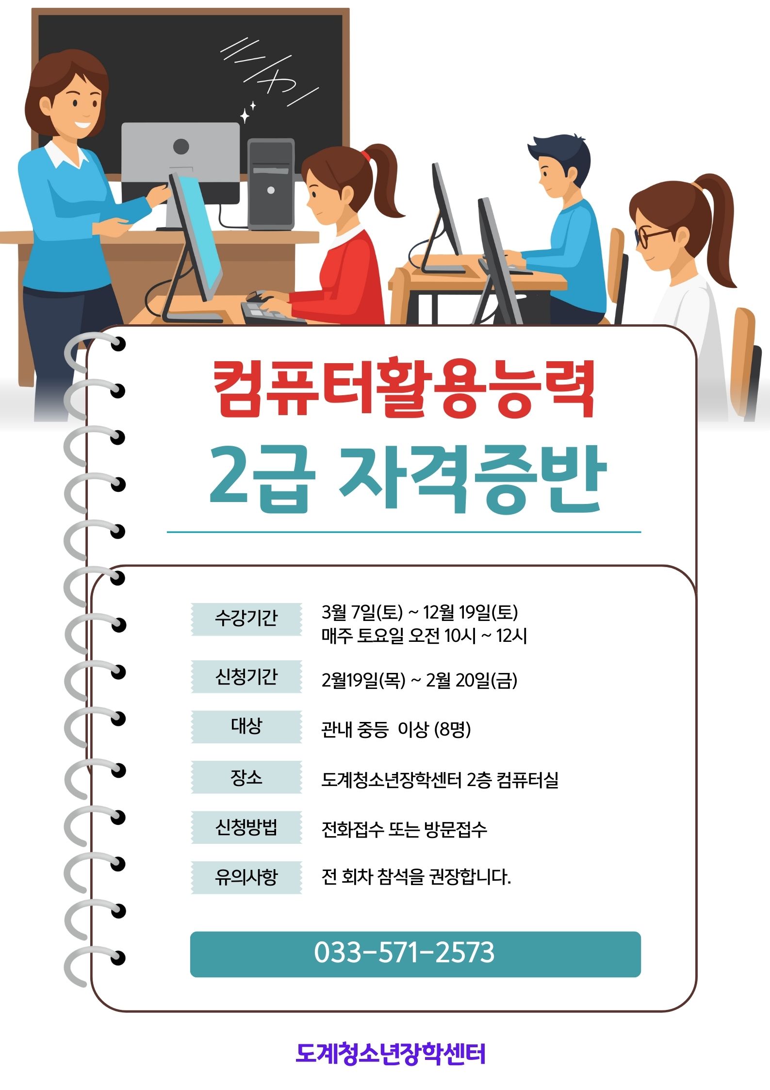 2026년 도계청소년장학센터 특성화 『 컴퓨터활동능력 2급 자격증반』 프로그램 참가자 모집